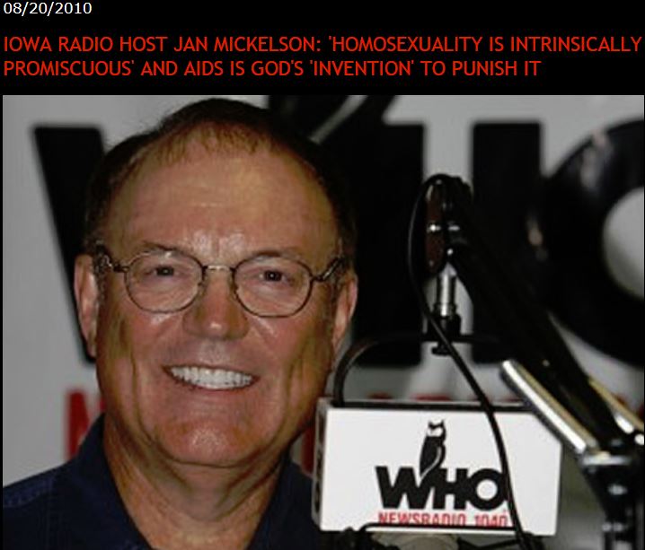 NOTE: Do you ever hear Mickelson's rants on WHO? Use the comments below and tell us what businesses most frequently sponsor his homophobic diatribes. You can comment anonymously.